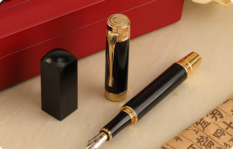 五福临门系列18K金笔——禄笔(左五),采用中国古老的点螺传统工艺,雕刻精美。